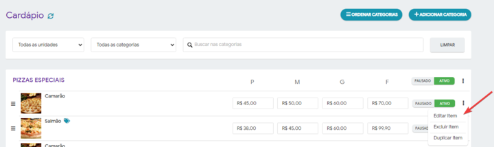 Passo 01: No painel gestor, clique na opção Cardápio > Localize o produto e clique em Editar.