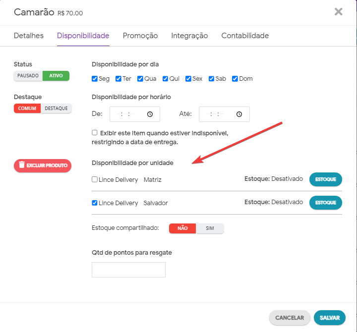 Passo 02: Dentro da aba Disponibilidade, você encontrará a opção para indicar as unidades onde este item estará disponível.