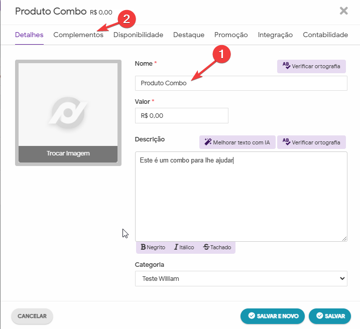 Escolha um nome para o seu combo e acesse a aba de Complementos: