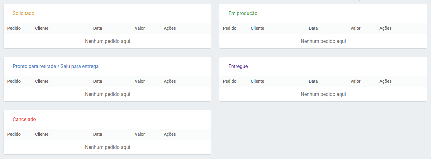 Para gerenciar seus pedidos, você precisa primeiramente acessar seu dashboard. Nele será exibido todos os pedidos com os status de: