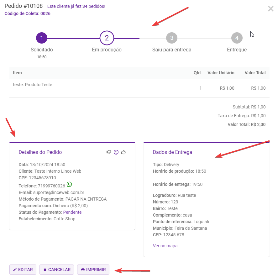 Ao visualizar o pedido você pode ter diversas funcionalidades e dados sobre o pedido:
