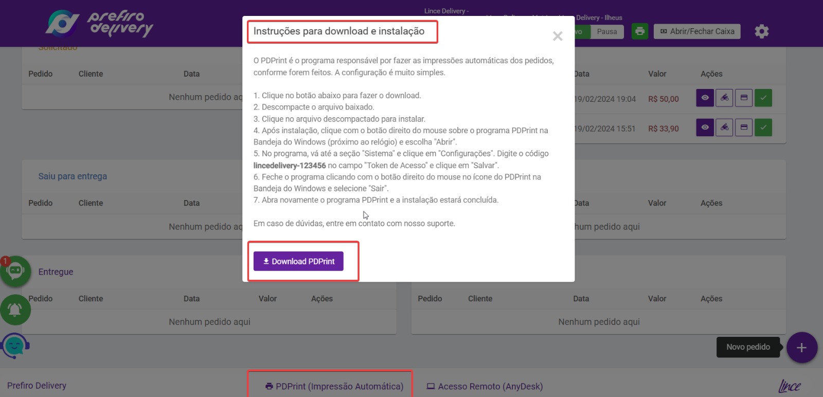 Uma vez clicado, aparecerá um modal/tela com instruções sobre a instalação do PDPRINT.