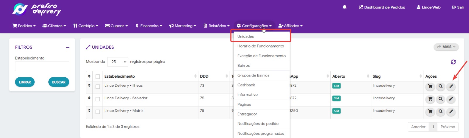 Para alterar o telefone do estabelecimento, que aparece no site, é muito simples, basta acessar o Painel Gestor, ir até o menu Configurações > Unidades. Edite a unidade que deseja alterar, clicando no ícone do Lápis, em seguida, altere o telefone e clique em Salvar.