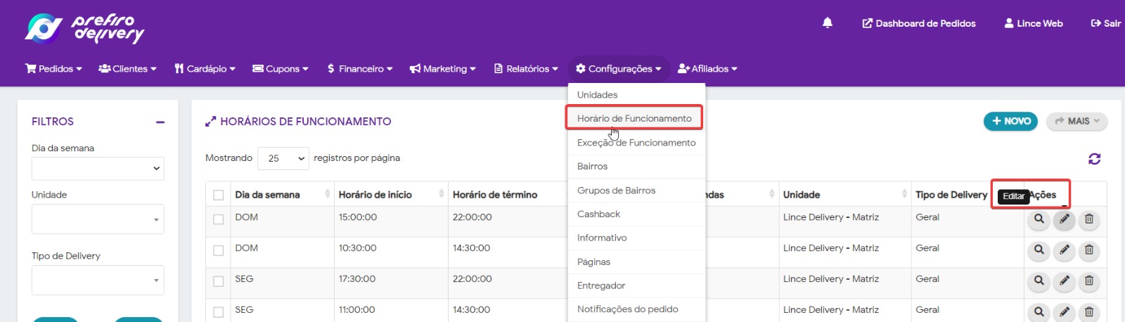 Para configurar os seus horários de entrega, no seu Painel Gestor clique em “Configurações”, clique em “Horários de funcionamento”.