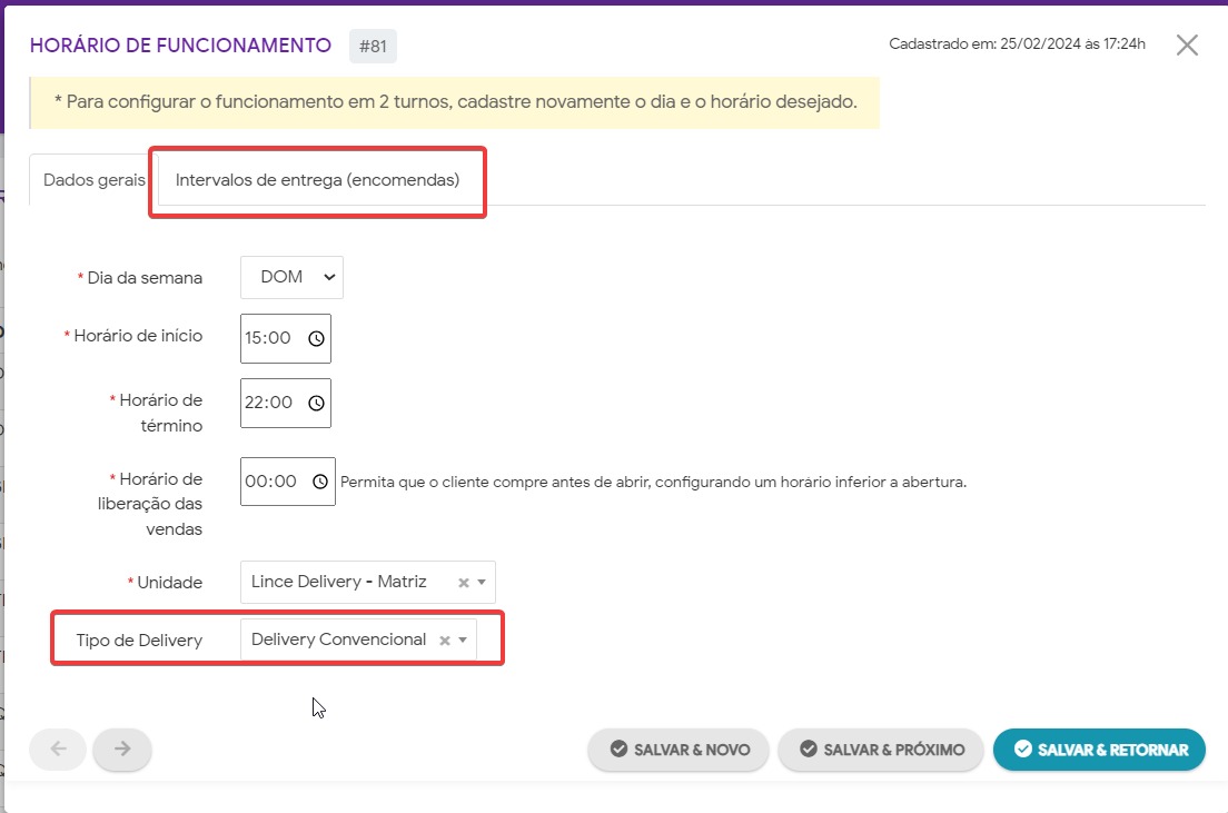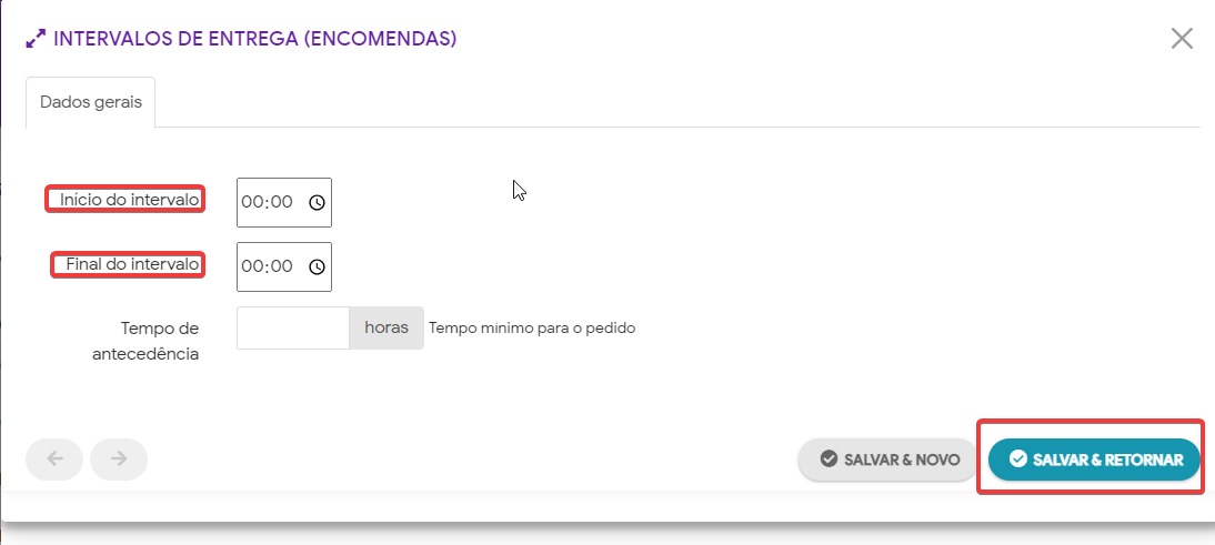 Ex.: Horário de funcionamento 08h às 18h | Intervalos de entrega 08h às 10h, 10h às 12h, 12h às 14h, e assim sucessivamente, neste exemplo o intervalo de entrega cadastrado foi de 2h em 2h