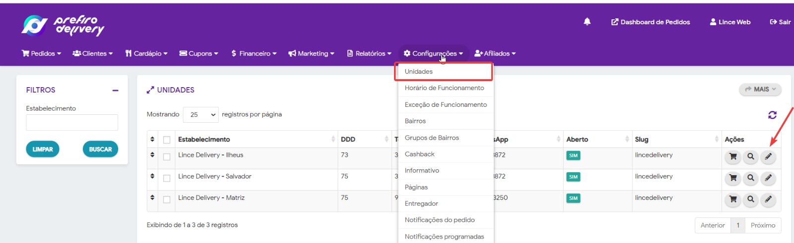 No seu Painel Gestor clique em “Configurações”, clique em “Unidades”, clique no lápis para editar a unidade.