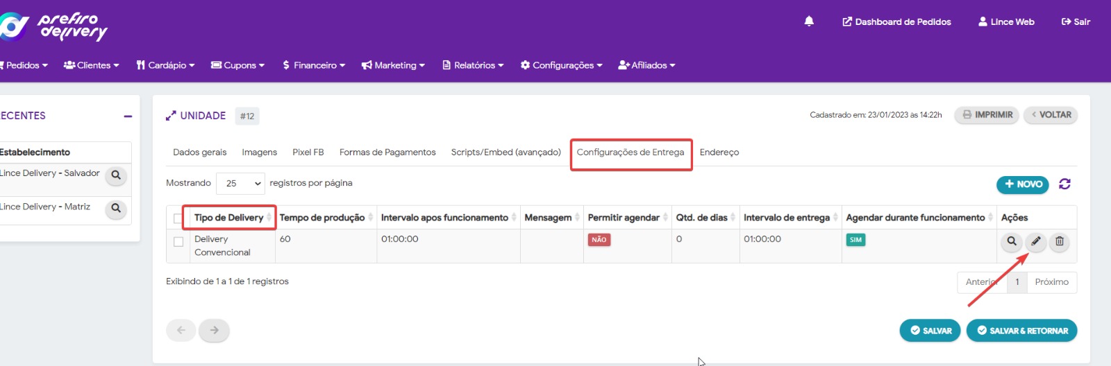 Na aba “Configurações de Entrega” verifique se a opção “Delivery Convencional” está cadastrada.