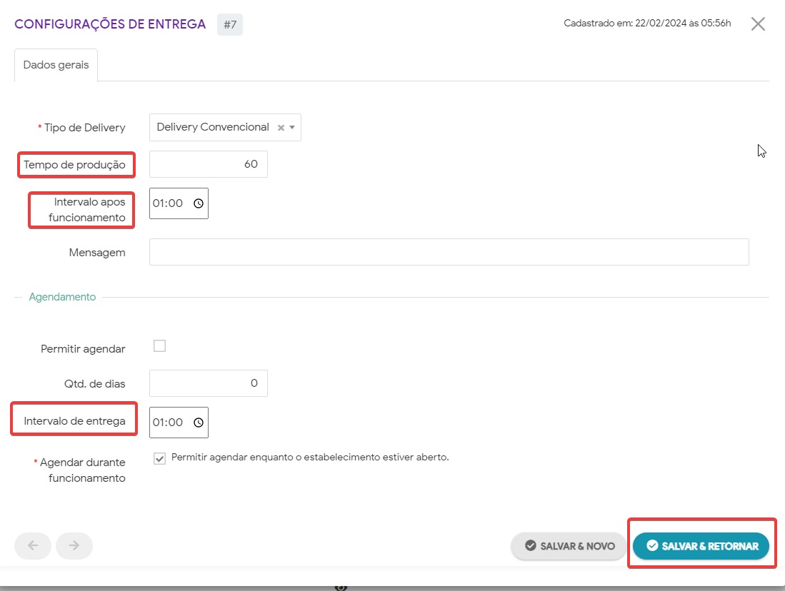 Tipo de delivery: Delivery Convencional, nesta janela você pode definir o seu tempo de produção, quantidade de dias apresentados no site para agendamento da entrega, e permitir o agendamento dos pedidos.