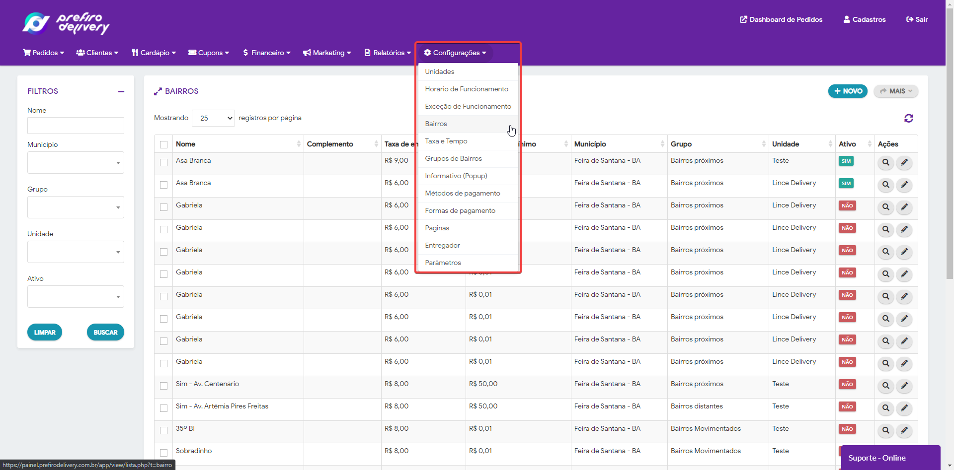 Passo 01: No painel gestor, clique em Configurações > Bairros.
