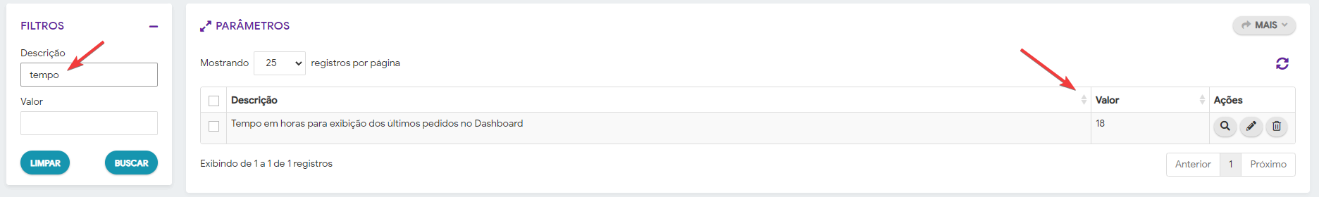Na tela de parâmetros localize o termo Tempo em horas para exibição dos últimos pedidos no Dashboard e clique no ícone do lápis para editar e colocar o tempo desejado em horas
